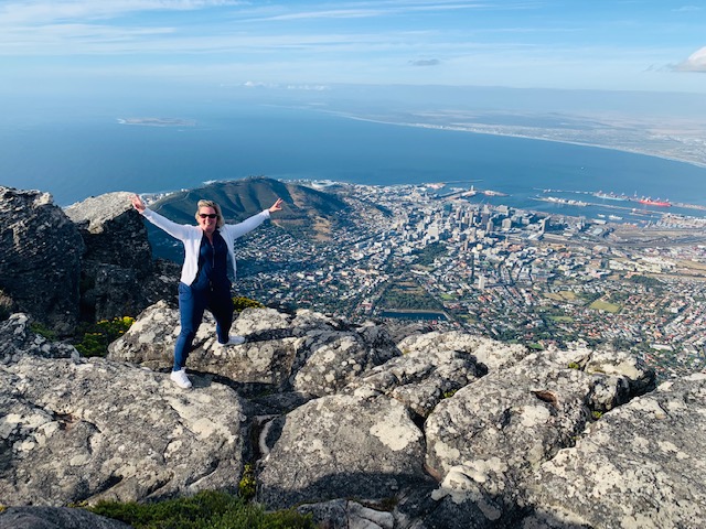 Al rozig gaan we richting de Tafelberg, en we hebben geluk , want deze is niet altijd zonnig en helder zicht, maar nu wel! Met de kabelbaan omhoog en prachtige plaatjes kunnen we schieten van elkaar en het uitzicht. De Tafelberg is een van de 7 wereldwonderen , zo, die kunnen wij toch mooi even afstrepen, wat een bofferds zijn we toch eigenlijk! En we boffen nog meer, want ons afscheidsdiner wordt geserveerd in een superhippe beachclub. Wauw, wat een heerlijkheid, ook deze dag was weer helemaal top!