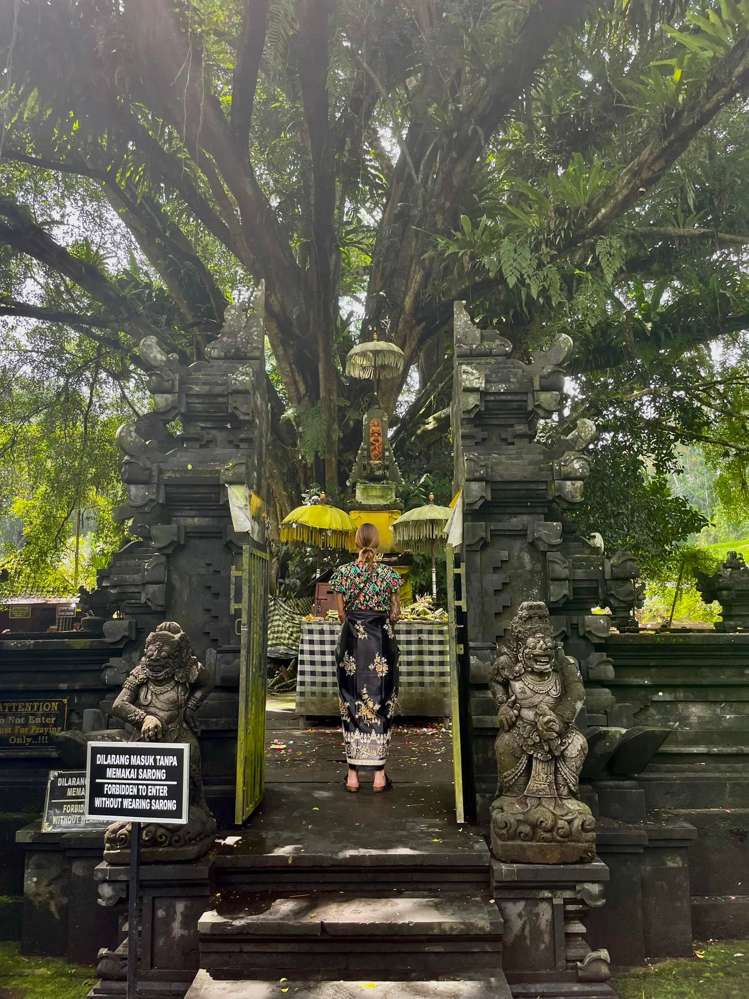 De eerste tempel heet Brahma Vihara Arama, een boeddhistische tempel in Banjar Tegeha. De afstand vanaf Sanur is behoorlijk; 3 uur rijden, maar persoonlijk vind ik dat helemaal niet erg, want je ziet zo veel moois onderweg. Zeker het laatste uur en 15 minuten zijn prachtig, het is eigenlijk het ‘echte Bali’: dorpjes, veel tempels, rijstvelden en vrijwel geen toeristen te bekennen. Bij aankomst hebben we een entreekaart gekocht voor de tempel en onze sarong omgedaan. Bij alle tempels op Bali dien je een sarong te dragen. Wij hebben deze een paar jaar geleden op Bali gekocht, dus we nemen altijd onze eigen mee. Als je eenmaal in de tempel bent en je wilt ergens naar binnen, moet je vaak je schoenen uitdoen.